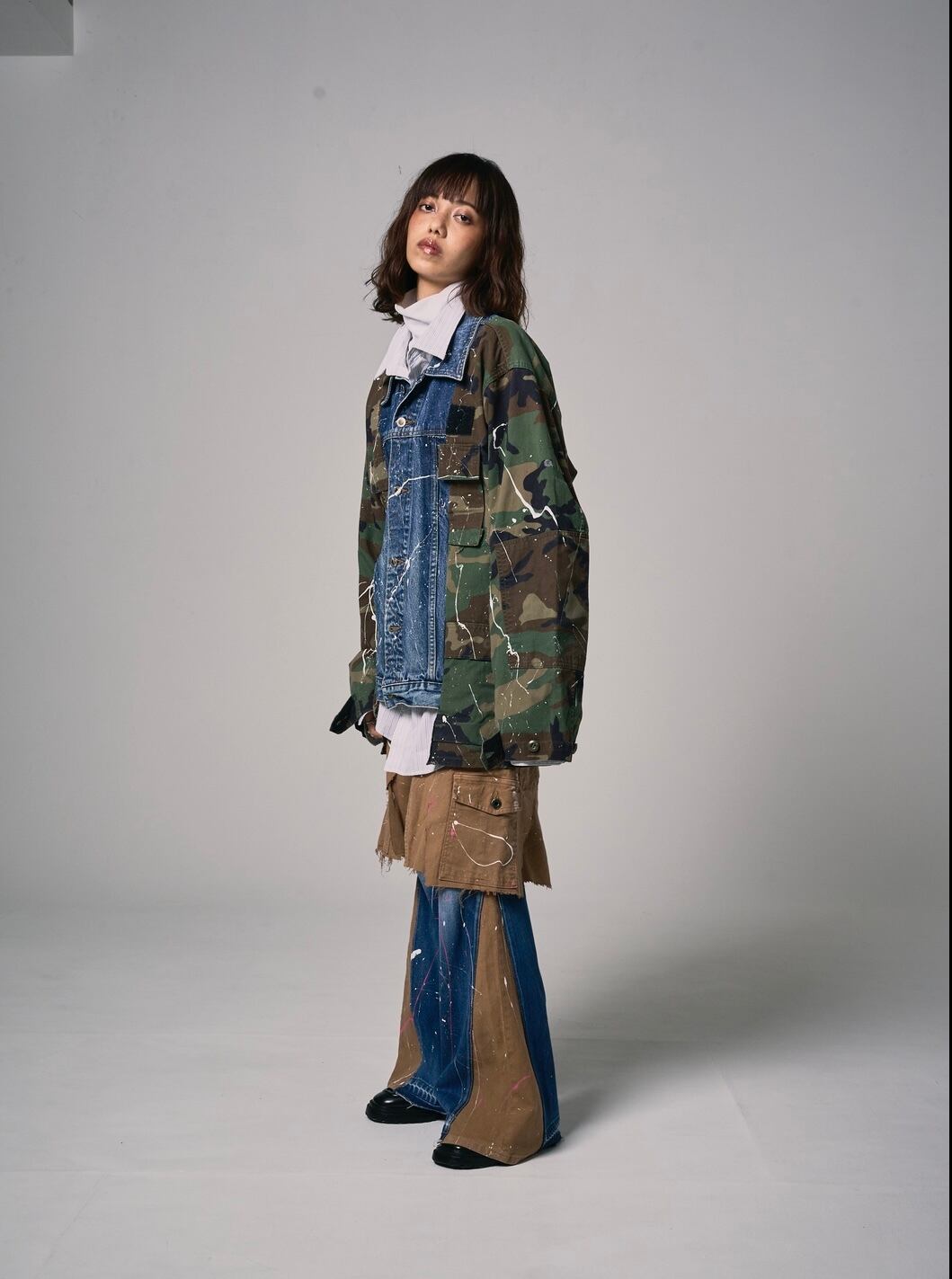 中心部分がデニムジャケットになっており、サイドからミリタリージャケットが切り替えられたデザイン。