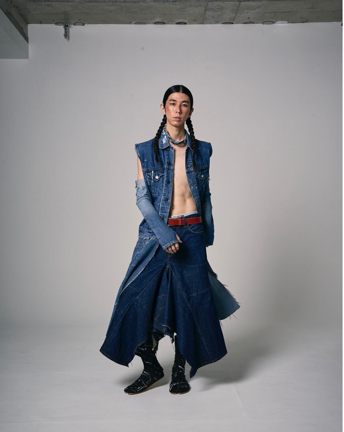 袖なしのデニムジャケットと、デニムのパンツをつなぎ合わせロングコートのように仕上げたアイテム。デザイナーによる、ハンドペイントが目を引くデザイン。