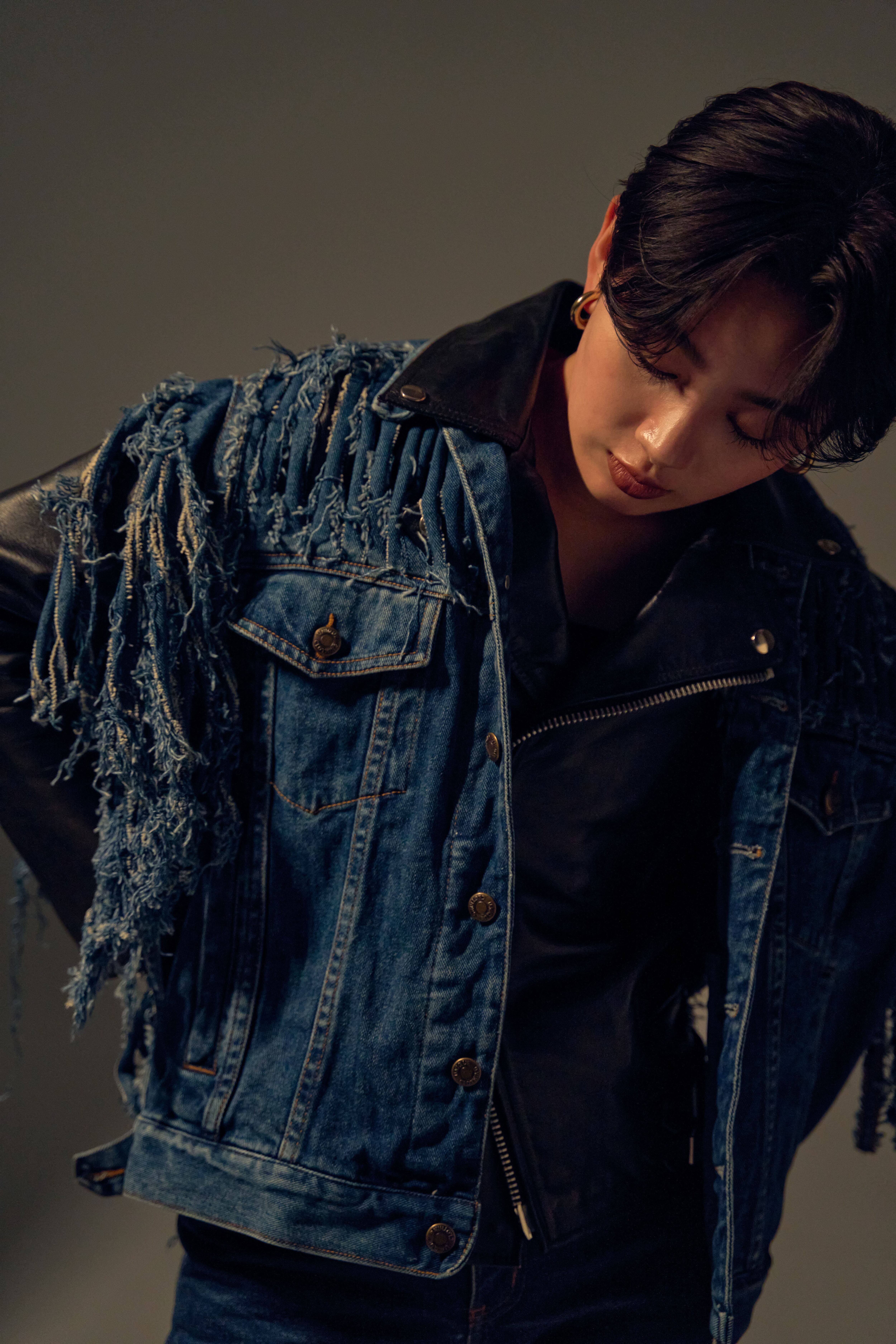 昨シーズンに続いて、デニムジャケットを短冊状に裂き、フリンジ加工が施されたデザイン。