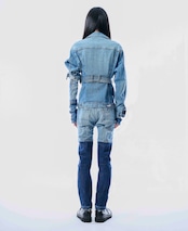 オーバーなデニムジャケットに、ベルトが付属されて様々な結び方で着用出来るデザイン。